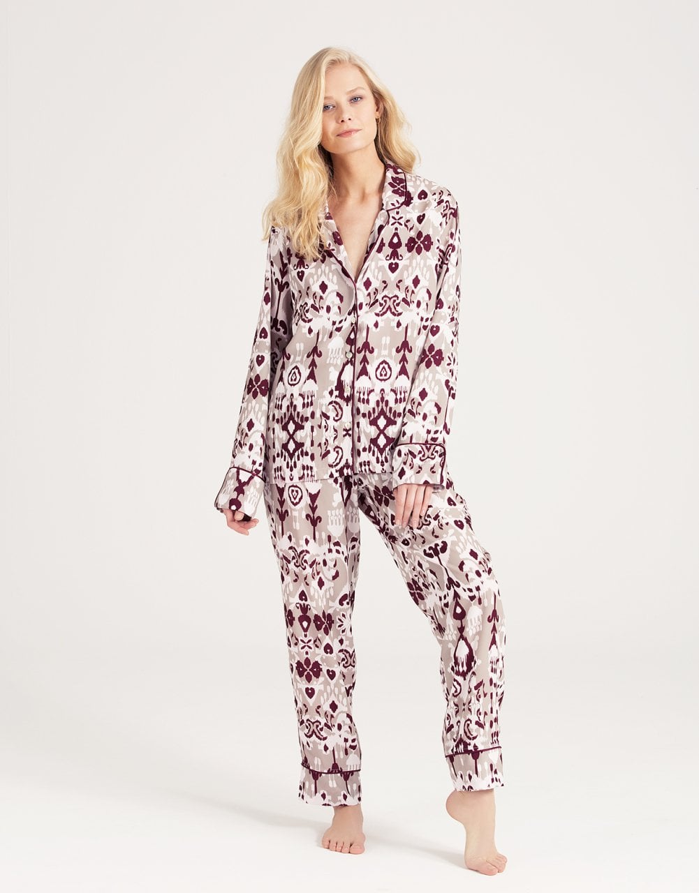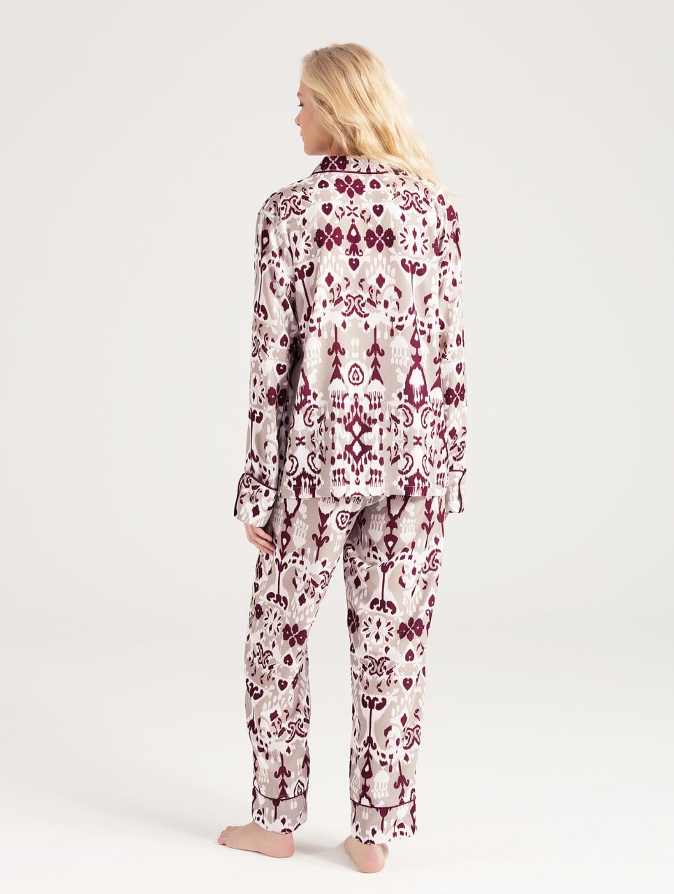 -أصفاد الأكمام ومنطقة الياقة وأطراف الساق مفصلة بحواف بيضاء من الساتان.