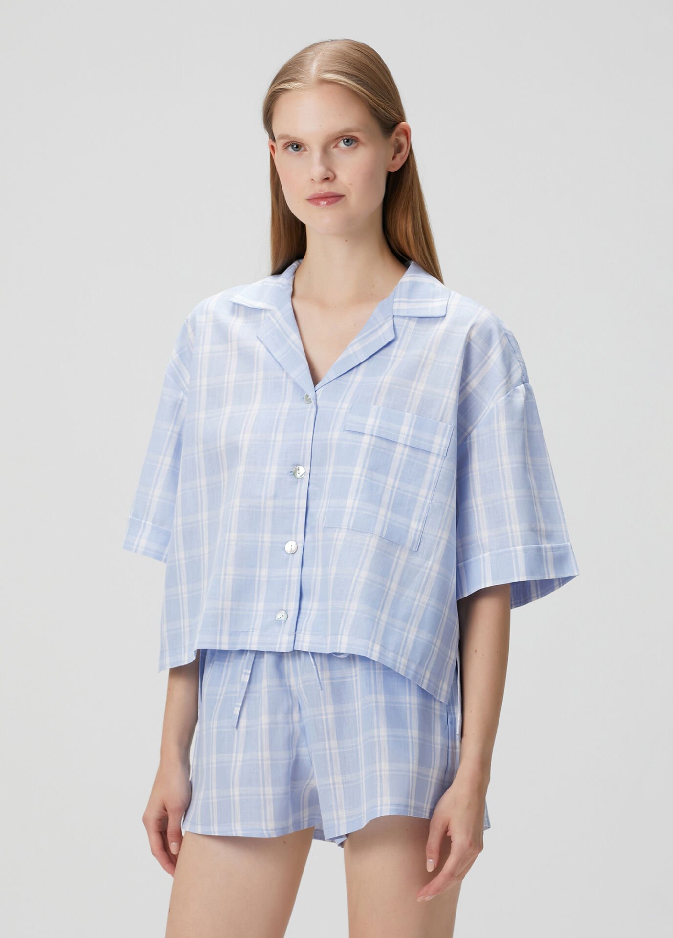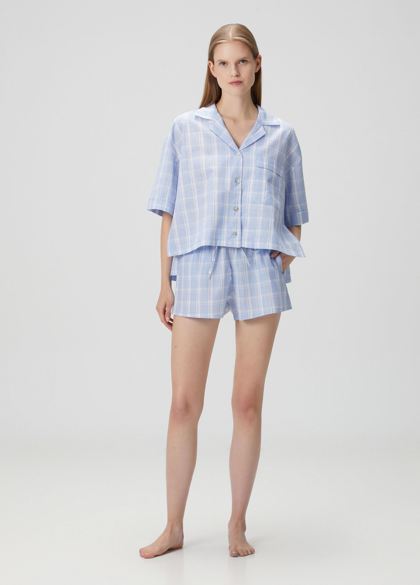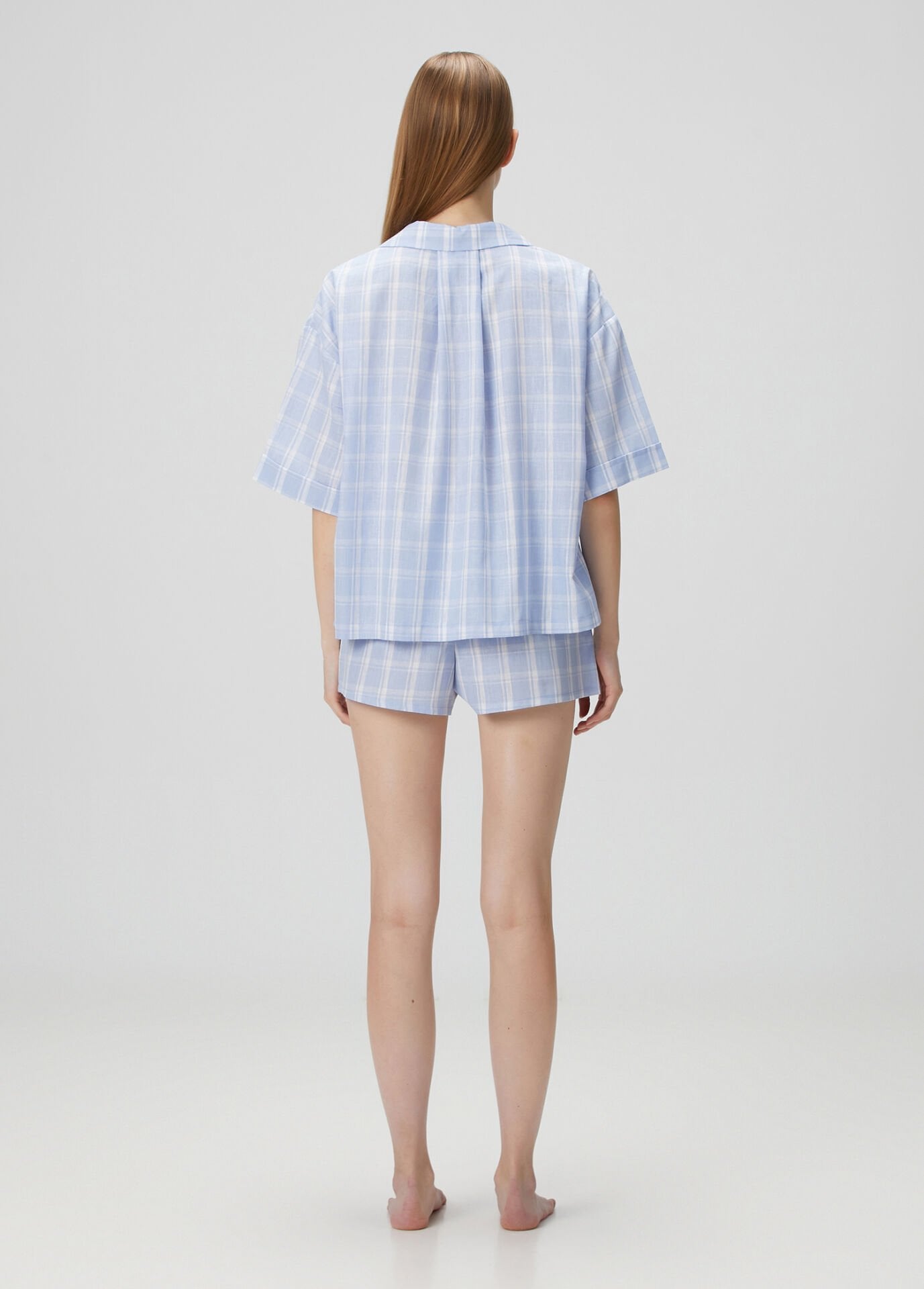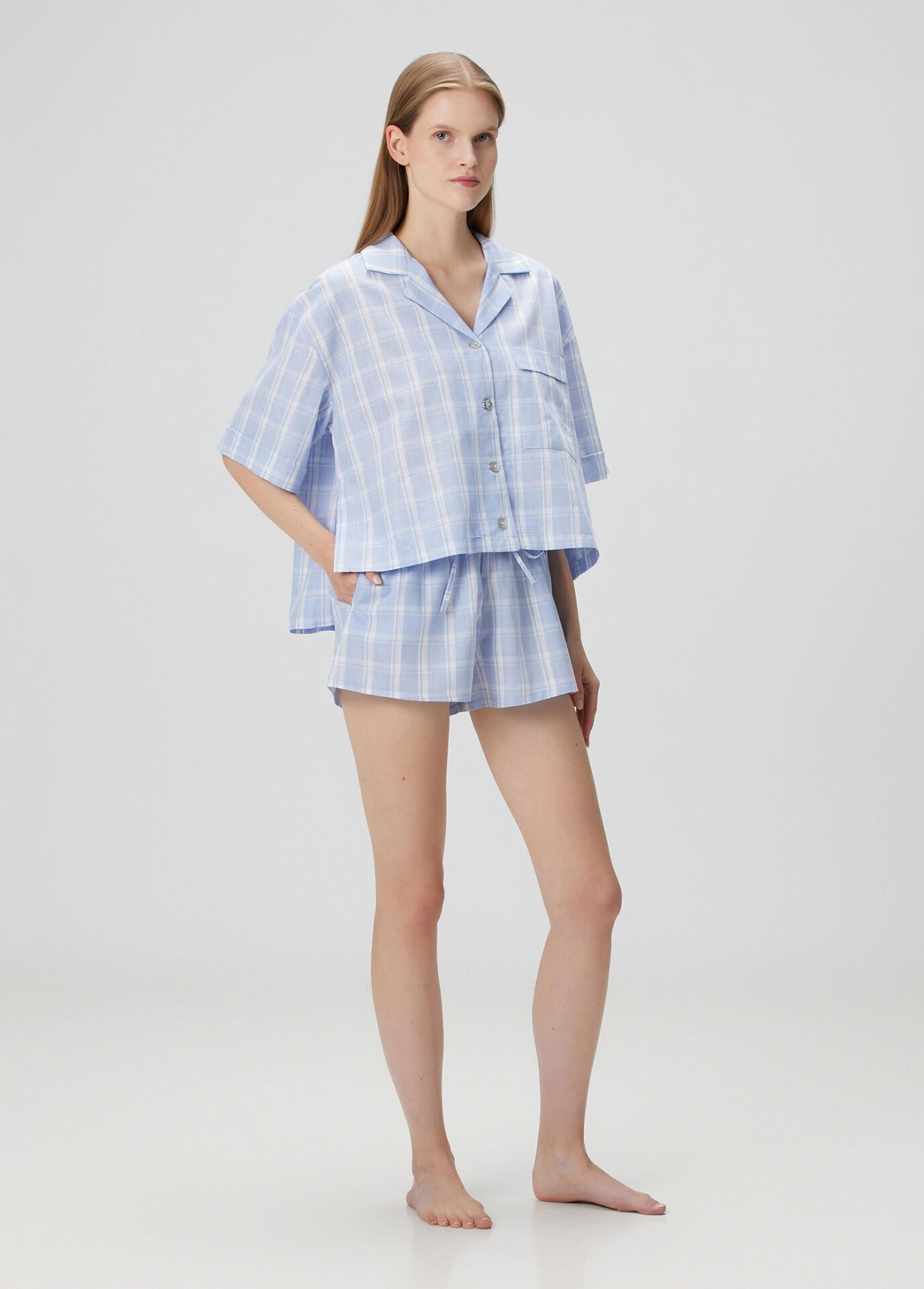 Gömlek yaka üst parçası ve lastikli beliyle rahat şortu sayesinde hem uyurken hem evde vakit geçirirken maksimum konfor sunar.