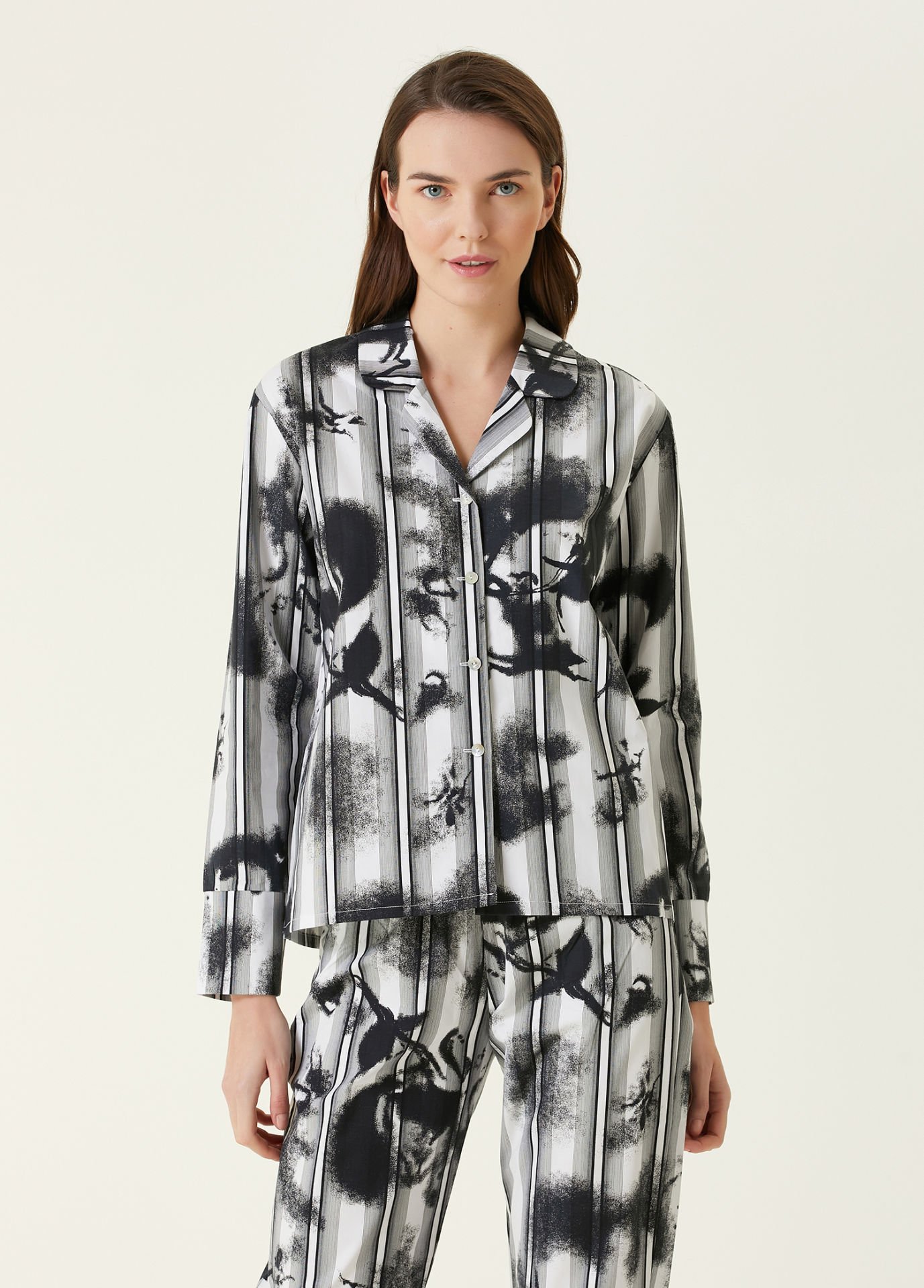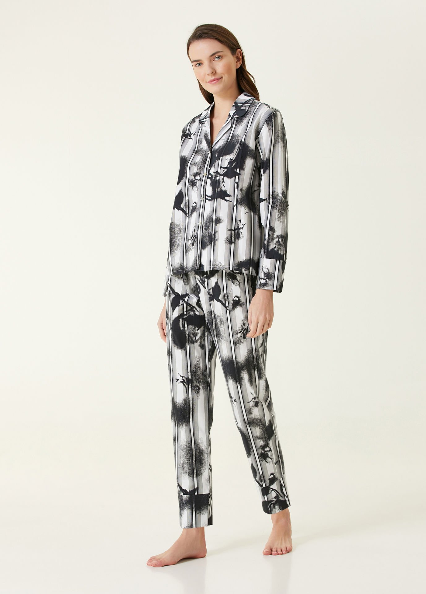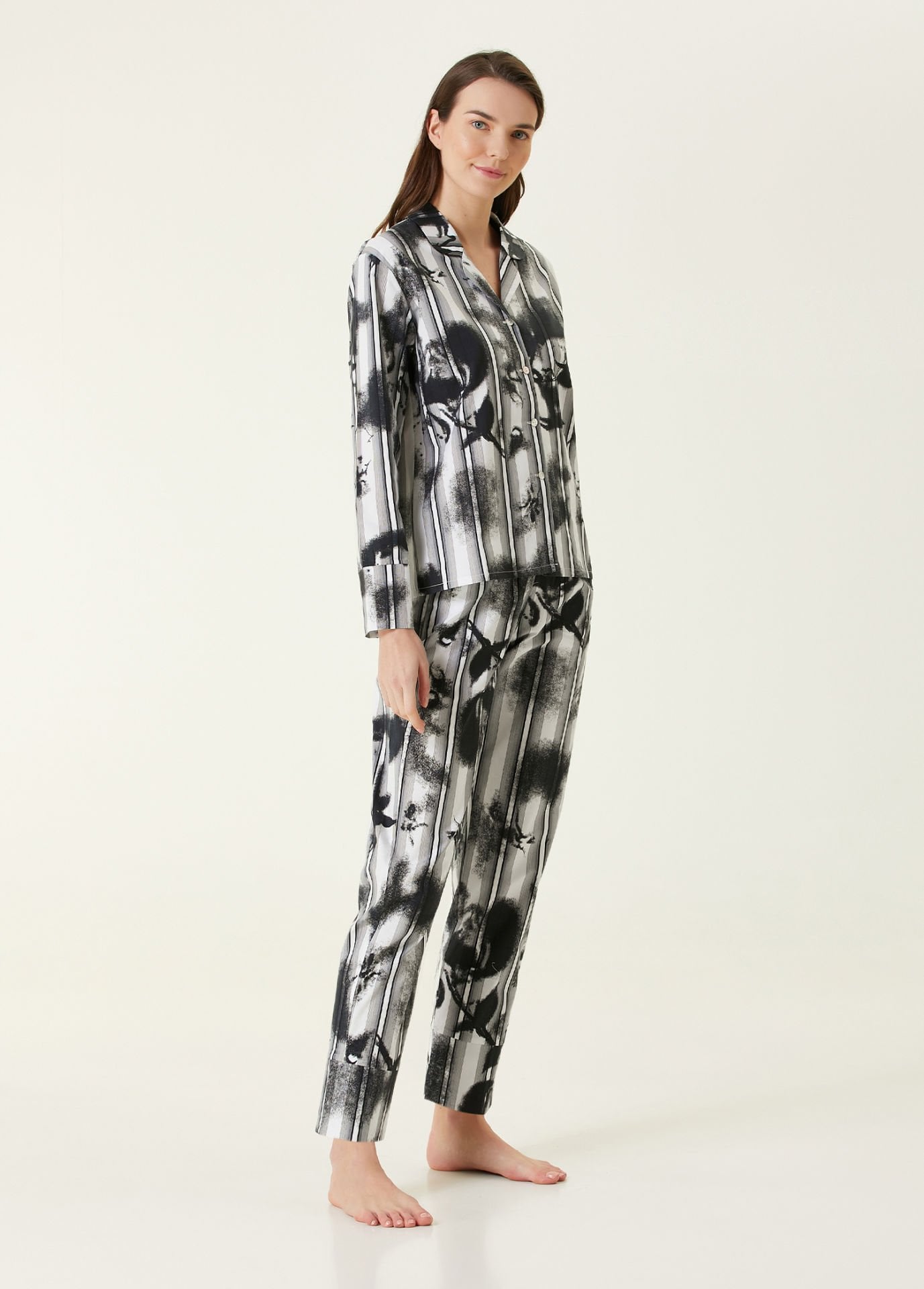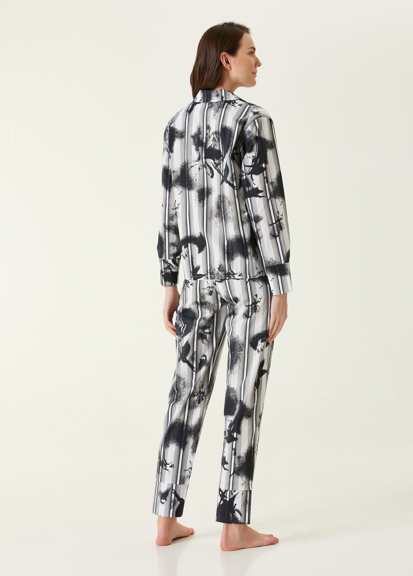 Bu premium pijama takımı, %100 doğal pamuk dokusuyla cildinizde nefes alan, yumuşak ve konforlu bir his bırakır. Dolgun ve pürüzsüz pamuk kalitesi sayesinde gece boyunca ferahlık sağlar. Modern çizgi ve boyama efektlerinin birleştiği özgün deseni, takıma karakteristik bir görünüm kazandırırken; üst bedende kullanılan gerçek sedef düğmeler doğal parlaklığıyla şıklığı tamamlar.